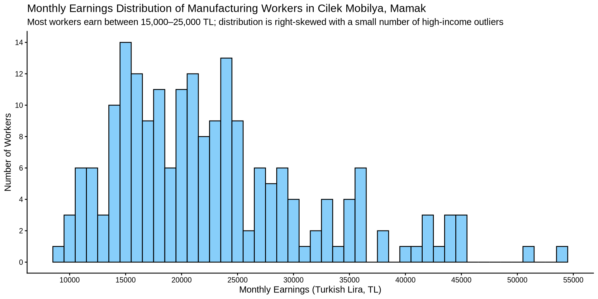 subtitle = "Most workers earn between 15,000–25,000 TL; distribution is right-skewed with a small number of high-income outliers",