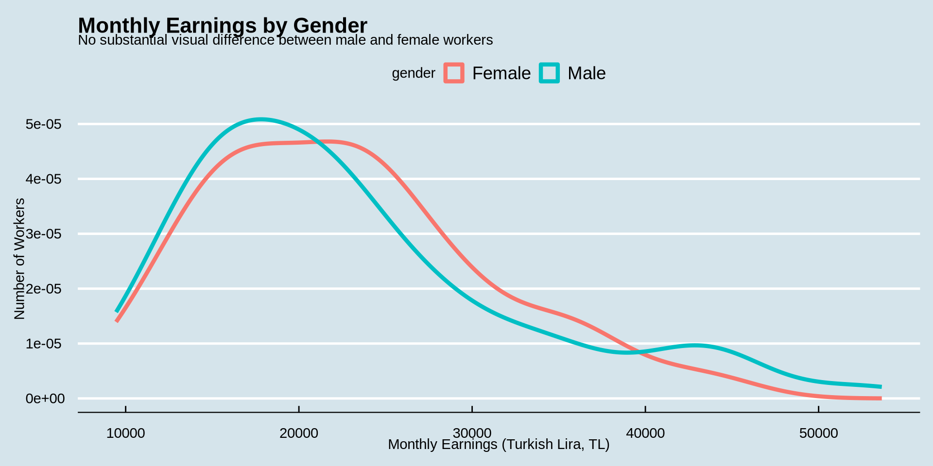 While our title is still fine, our subtitle could be better since we are not showing counts anymore. Lets change it to “The highest concentration of earnings lies between 15,000–25,000 TL; the distribution is right-skewed with a long upper tail”